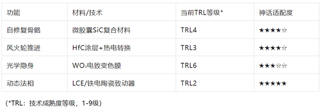 另外,能源系统可能需要考虑,比如哪吒的法力来源。这里可以用压电材料,将机械能转化为电能,或者热电材料利用体温差发电,为其他功能供能。光学特性方面,光子晶体或荧光材料可以让身体发光,增强视觉效果。